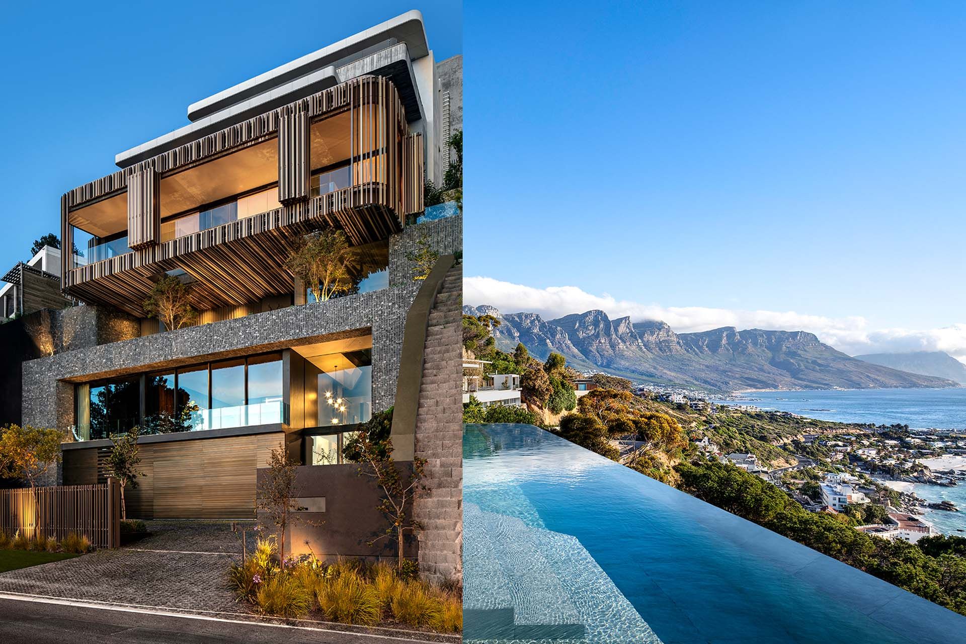 A true architectural marvel, Obsidian Villa is a striking five-level property built directly into the mountainside of Clifton, seamlessly blending with its natural surroundings of granite, glass, and wood. This 5-star luxury villa is designed for ultimate relaxation and provides a peaceful atmosphere with breathtaking views of the Atlantic Ocean and the Twelve Apostles mountain range. It is a stunning, minimalist sanctuary that offers a profound connection to the landscape.